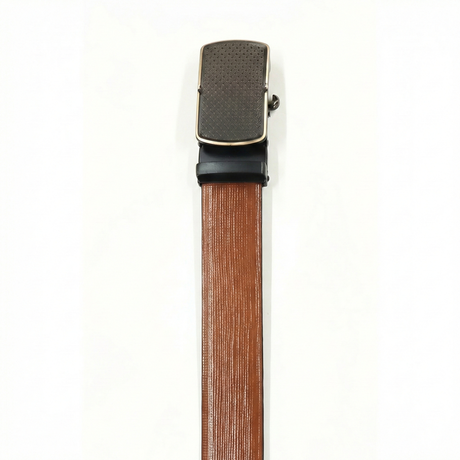 Innovative Auto-Lock Buckle This model utilizes an auto-lock mechanism instead of traditional belt holes, ensuring a precise, adjustable, and comfortable fit. The buckle features a dark, dotted texture on its face complemented by a polished metallic trim, providing a contemporary edge to your attire.